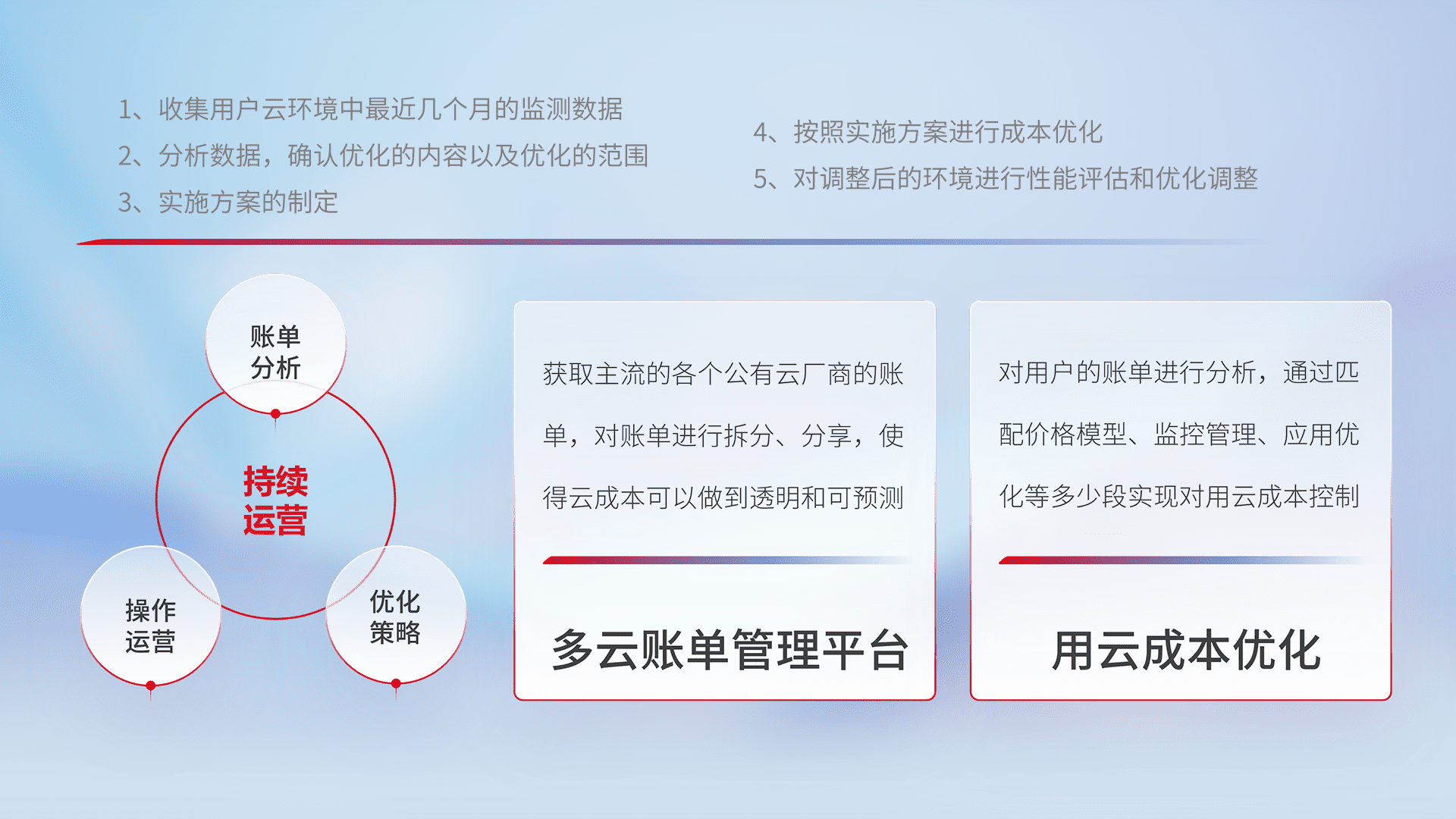 通过多云纳管,,,以统一的资源数据模型把客户的云资源进行抽象和封装,,,,进而实现对多云资源的统一操作,,保障云资源管理的可靠性、、稳定性与可用性。。量身定制化运维内容,,,配置、、开发运维、、、、补丁管理、、备份、、监控、、、认证和访问管理、、、审计和日常巡检等,,,保障在用云过程中的可靠度,,,,稳定度以及高可用率。。